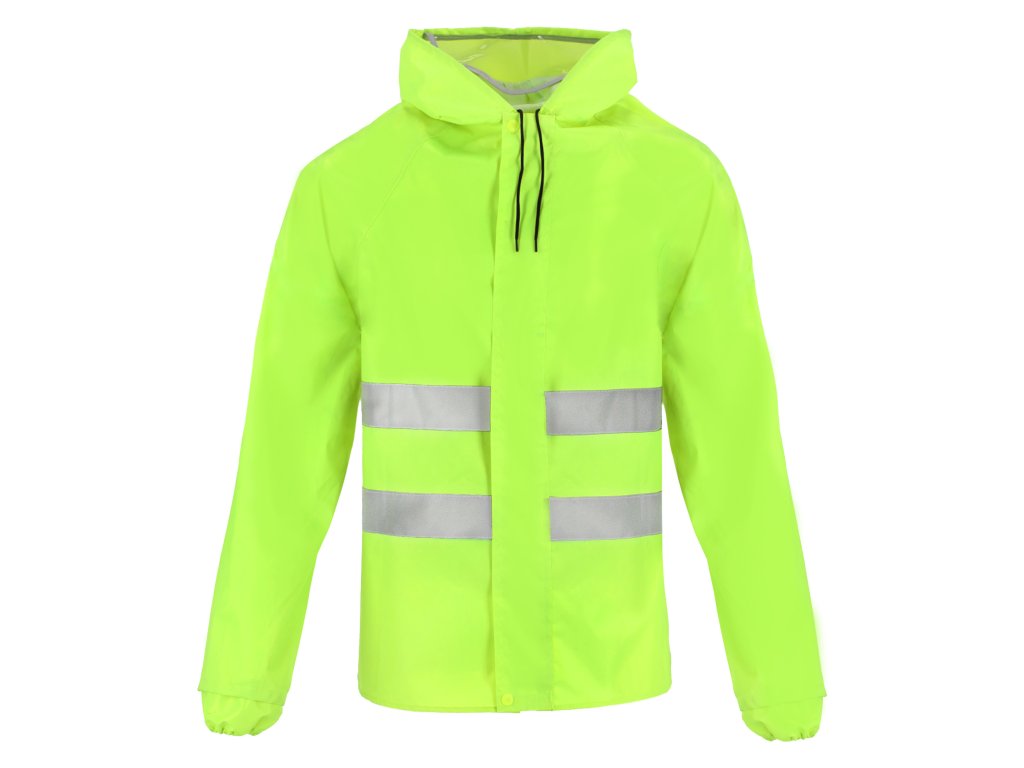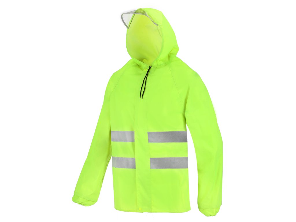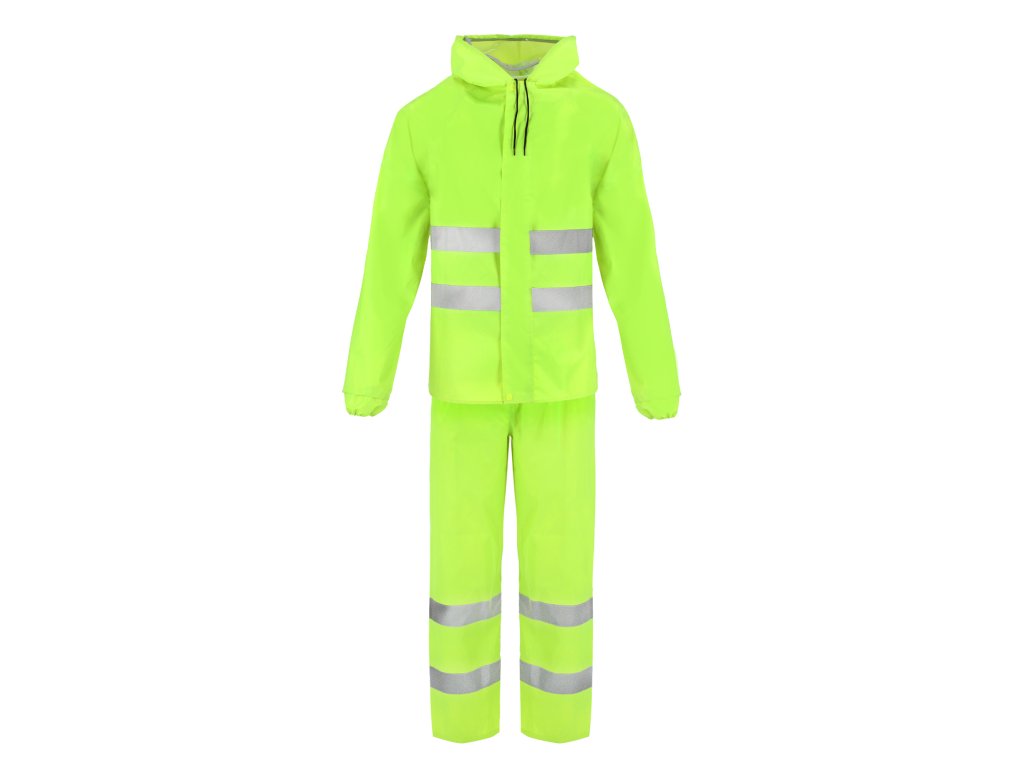 Nepromokavé oblečení RAINVIS vyrobené z voděodolné tkaniny (polyestrická pletenina 65% potažená PVC 35%). Sada se skládá z bundy a kalhot do pasu. Bunda je zapínaná na zip chráněný klopou se zapínáním na druky. Má kapuci s průhledným kšiltem staženou šňůrkou. Rukávy jsou zakončeny pružným manžetou. Kalhoty do pasu s elastickým stažením v pase. Každá sada v samostatném obalu pro skladování (uchovávejte v suchu). Barva žlutá s reflexními pruhy. Velikosti: S-XXL. Balení 1ks