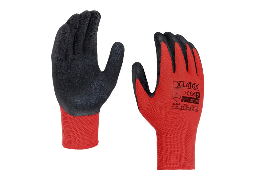 Rukavice X-LATOS vyrobené z červeného polyesteru, potažené na úchopové části latexem s drsnou strukturou. Ideální pro manuální práce. Velmi dobré uchopení. Dobře se přizpůsobují tvaru dlaně. Roztažitelné a pružné. Ukončeny manžetou. CE EN 388.