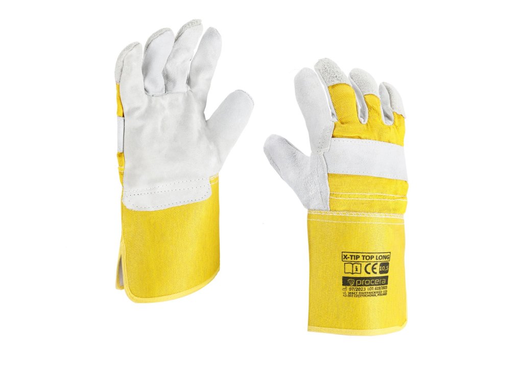 Pracovní rukavice zesílené kůží duplon, celodlanové, tkanina plátno v žluté barvě. Chytací část vyrobená z jednoho kusu hovězí duplonové kůže v přírodní barvě. Zesílení z kůže na linii kostí ruky a na špičkách prstů. Dlouhý plátěný manžet, pogumovaný, zakončený lemováním. Vnitřní chytací část podšívkovaná. Kat. I.
