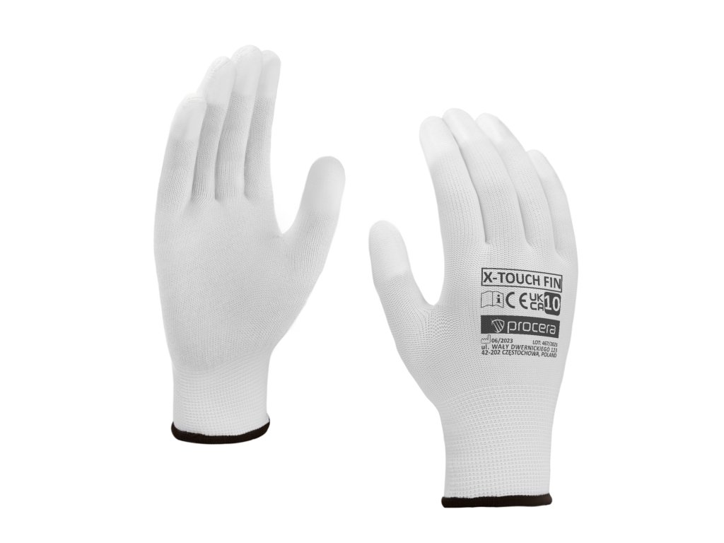 Rukavice X-TOUCH FIN vyrobené z polyesteru, potažené bílým polyuretanem na špičkách prstů. Ideální pro manuální práci. Velmi dobré cítění držení předmětu. Dobře se přizpůsobují tvaru ruky. Stretchové a elastické. Ukončené pružným lemem. CE EN 420. Balení: karton 12/240. Barva: bílá/bílá.